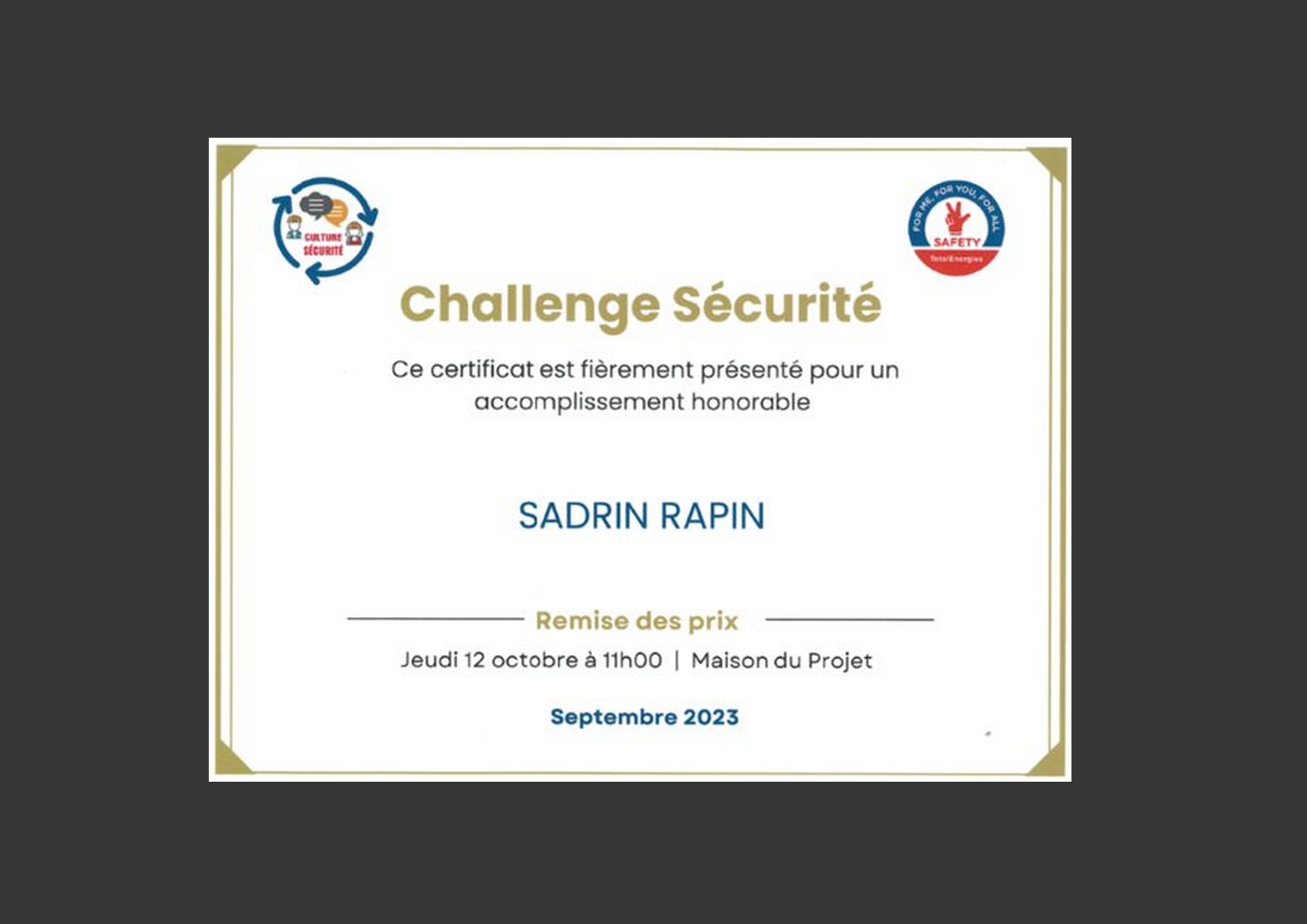 Nous sommes heureux de vous annoncer que Sadrin Rapin a été récompensée en octobre 2023 par TotalEnergies dans le cadre du Challenge sécurité sur le chantier de GRANDPUITS pour « l’amélioration de nos standards depuis les débuts des travaux sur le site ».